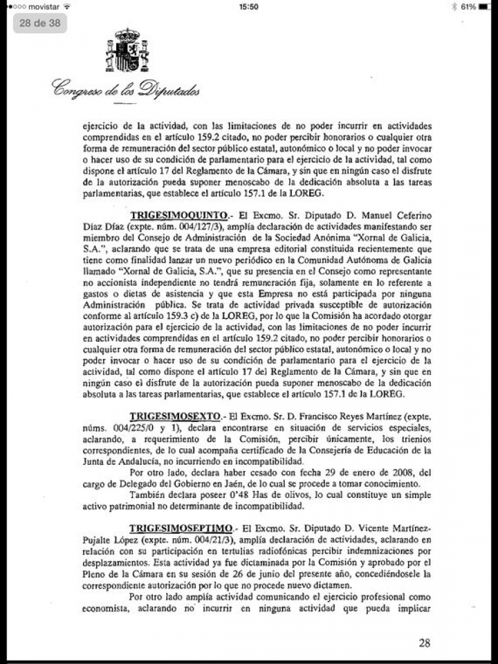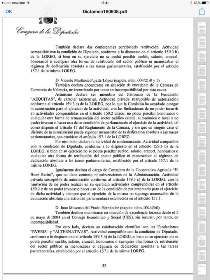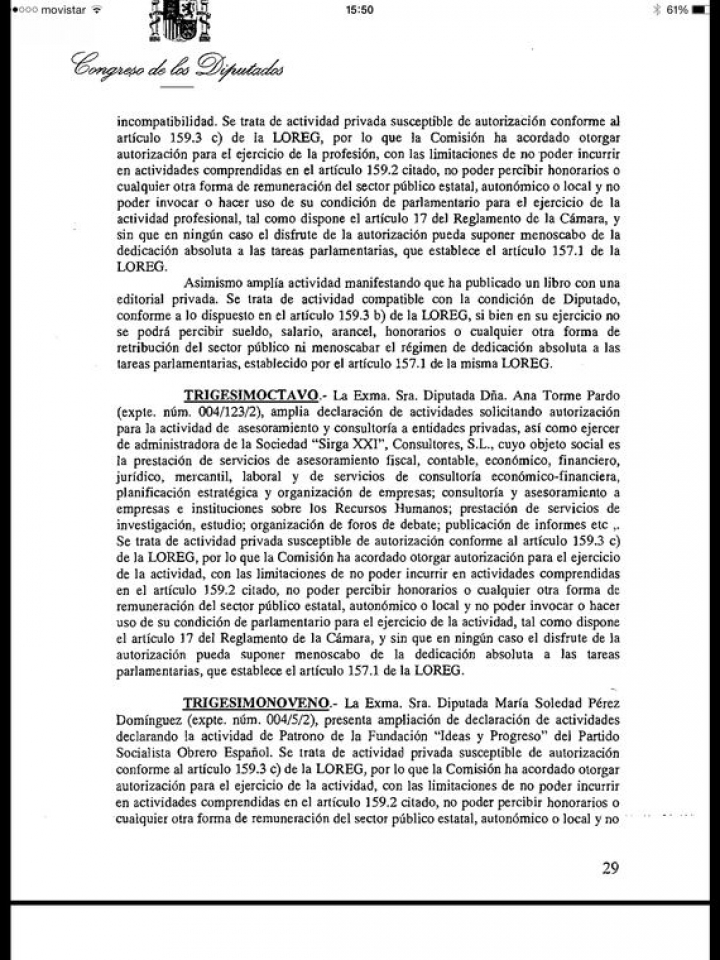 La Comisión del Estatuto dictaminó a favor de la compatibilidad en ambos casos, si bien les recordó la obligación de cumplir con el artículo 17 del Reglamento del Congreso. Un detalle no menor, ya que además de que la Constitución y la Ley Electoral establecen de forma nítida que la función parlamentaria debe ejercerse en "régimen de dedicación absoluta" y que será incompatible con cualquier actividad pública o privada retribuida (salvo la investigación, la docencia y la creación literaria) el Reglamento del Congreso añade en su Capítulo III que "los diputados no podrán invocar o hacer uso de su condición de parlamentarios para el ejercicio de actividad mercantil, industrial o profesional". Y nadie duda, a estas alturas, que Pujalte fue contratado no por ser economista, sino por ser diputado.