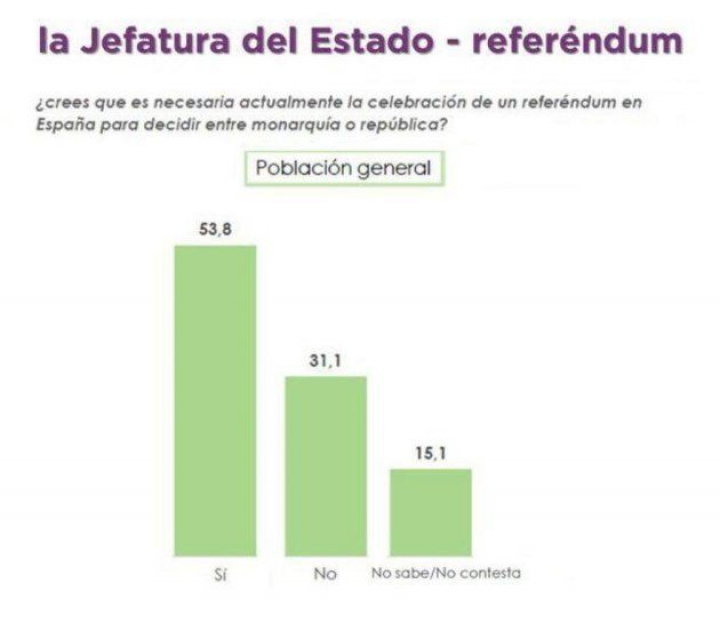 Los datos de una encuesta propia realizada recientemente, además, les avalan: un 54 por ciento de los españoles estaría favor de un referéndum, mientras que sólo un 31 por ciento estaría en contra de una consulta sobre la Jefatura del Estado. El mismo sondeo revela también que la Monarquía es una institución que representa el pasado y que los ciudadanos la asocian con la corrupción. Sólo el 16 por ciento de los preguntados relaciona Monarquía con democracia.