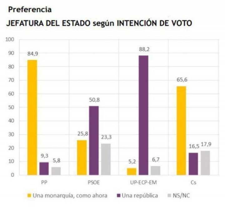 Tan es así que en la encuesta de Podemos, un 51% de quienes declaran que votarán al PSOE son partidarios de la república, mientras que un 26% prefiere la monarquía. El porcentaje de republicanos se eleva hasta el 88 por ciento en los votantes de Podemos mientras que sólo recibe un apoyo del 9,3 entre los populares, una cifra que se eleva hasta el 16% en el caso de los que apoyan a Ciudadanos.