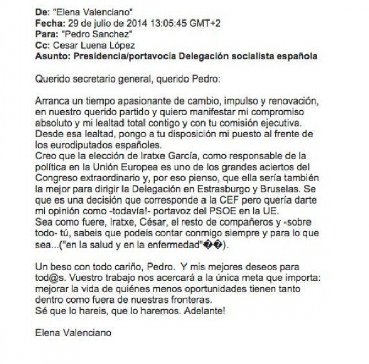 Respecto a Iratxe García, la nueva jefa de la delegación socialista en Bruselas, fue la propia Valenciano quien la propuso para el puesto al entender que, habiendo formado ella parte de la anterior dirección de Rubalcaba, debía dar paso a otras personas. Así se lo expresó en un correo que envió a Pedro Sánchez y a su número dos, César Luena, el pasado 29 de julio con el siguiente contenido: