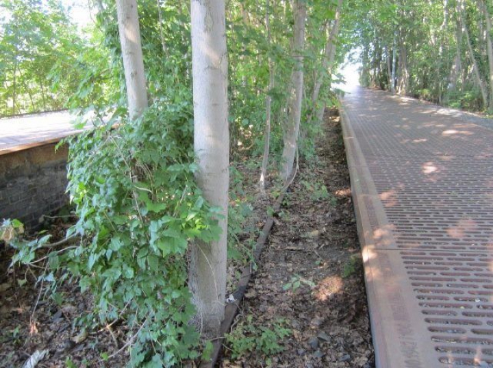 Dalt, s'han substituït els rails d'una de les vies per uns enreixats metàl.lics que recorden cada un del combois que mes rere mes van sortir durant cada any de la guerra i que acaba en un terra fet de trossos de carbó. L'altre fragment de via, que discorre al costat de més enreixats metàl.lics commemoratius, s'ha inutilitzat (esperem que per sempre) a base d'uns bedolls que hi van creixent i creixent. Esfereïdor i íntim, posa el cabells de punxa. IMG_3305 y/o IMG_3307