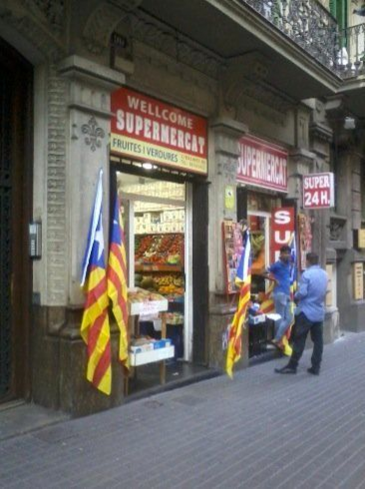 La gente que se lo pasa mejor es la que va en moto, banderas diversas al viento, el claxon a toda máquina. Para ir, tomo el bus (a ver hasta dónde me acerca). En la parada hay un grupito heterogéneo de gente, dos parejas mayores, dos o tres pandillas. Me fijo en la tienda paquistaní que hay delante de la parada, como las tiendas chinas, todo un testimonio de la vitalidad del independentismo: toda la entrada está llena de estelades.