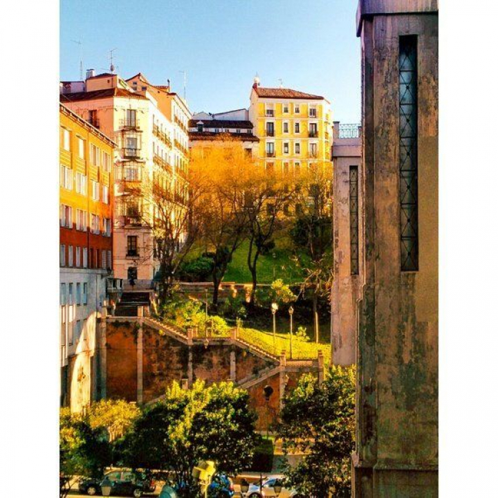 Solo hay que bajar por la escalera del pintor y esperar a que el sol empiece a filtrarse entre la estructura de piedra del viaducto para disfrutar de un espectáculo de luz que hace que las casas de esta parte antigua de Madrid, dibujadas en colores, brillen. No todas las puestas de sol hay que verlas desde un alto para disfrutarlas y esta es una de esas de a ras de suelo.