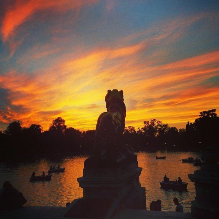 Desde cualquiera de los ángulos del parque de El Retiro merece la pena ver la puesta de sol. Aunque la clásica es verla desde el otro lado del pequeño lago que le rodea y ver como parece que arde desde dentro es un momento único.
