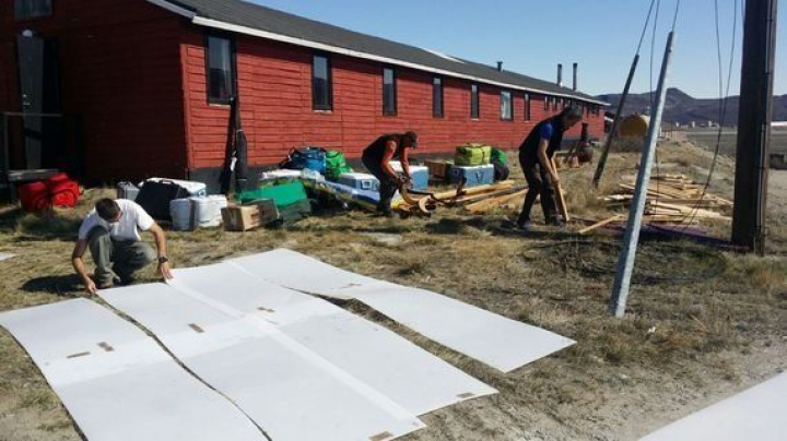 Y el lunes aterrizamos en Kangerlussuaq, al oeste de la isla ártica. Pese saber que este año el deshielo se ha adelantado, no estábamos preparados para lo que nos esperaba en esta localidad, la más cercana a nuestro punto de partida. El calor es casi agobiante. De hecho, de día estamos en en manga corta, y sudando en cuanto nos ponemos a preparar el Trineo. Es la peor noticia posible: en abril ha habido 4ºC por encima de la media, según la NASA. No lo es sólo por lo que supone para el clima global que se derrita el inlandsis de Groenlandia semanas antes de lo habitual, sino porque puede que nos encontremos agua donde debería haber hielo, y el Trineo de Viento, evidentemente, no flota. Llevaremos 2.000 kilos de carga cuesta arriba. Y nos esperan 2.000 kilómetros de recorrido arrastrados por cometas.
