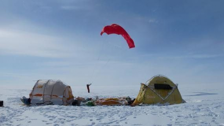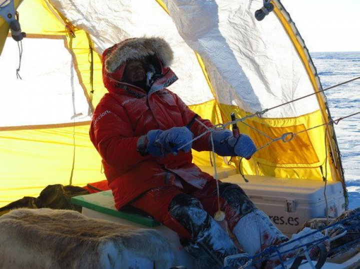 De las últimas horas hemos pasado muchas dentro de una nube, como en una burbuja en medio de un entorno gris en la que cinco personas, cuando el viento para, tenemos tiempo suficiente para trabajar, leer, escuchar música, cocinar en nuestro pequeño hornillo y, sobre todo, conversar de las mil aventuras y expediciones pasadas y de las que esperamos para el futuro. Y cuando sopla, arrancamos lentamente, avanzando despacio para poder reaccionar si encontramos grietas o agua en nuestra ruta.