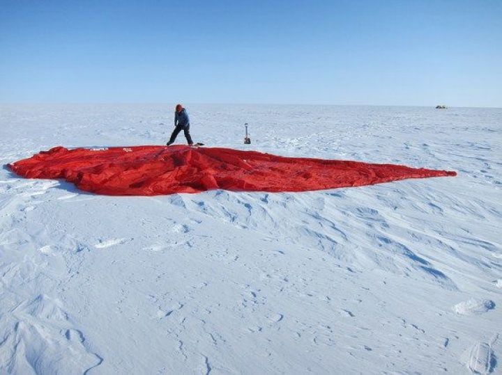 En cuanto se calmó el potentísimo viento catábatico, Ramón y Karin salieron a buscar la cometa. Perderla era un tremendo problema, así que a las tres de la mañana se pusieron en marcha y ... tuvieron una suerte que aún no nos la creemos. Estaba a menos de cien metros de distancia, algo enterrada en la nieve pero visible. Con los mandos y los trescientos metros de líneas. Nos llevó un buen rato desenterrar de la nieve el trineo, que estaba totalmente sepultado tras la tormenta, pero ahora ya está operativo y tenemos previsto reiniciar la marcha en poco tiempo. Hemos recorrido 250 kilómetros y estamos ya a 2.030 metros de altitud. Cuando escribimos, el viento nos es favorable, aunque esto puede cambiar en unas horas.