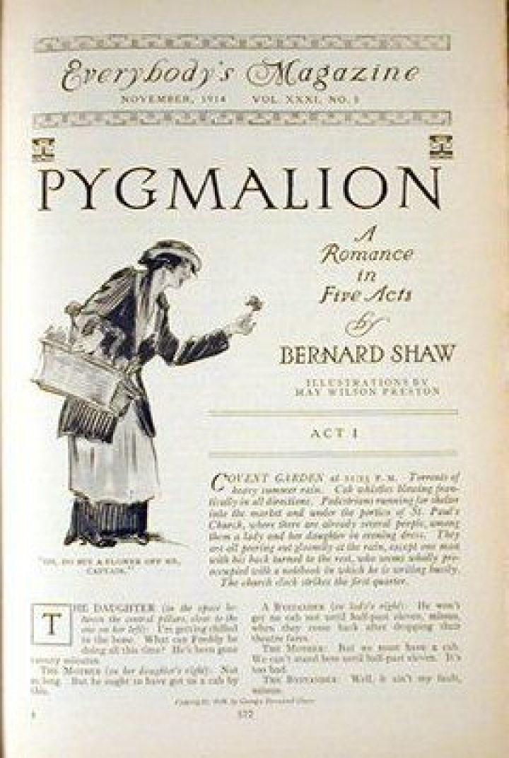 Henry Higgins, profesor de fonética, al atravesar el mercado londinense de Covent Garden, se siente atraído por el peculiar acento y el vocabulario cockney de una joven florista, Eliza Doolittle. Apuesta con su amigo el coronel Pickering, también apasionado por la lingüística, a que será capaz de convertir a Eliza en una duquesa haciéndole hablar un correcto y sofisticado inglés, para lo que convencen a la muchacha. Y el experimento tiene éxito. Pero Higgins, el Pigmalión de Bernard Shaw, insensible fanático de la fonética, es un solterón empedernido, con un descomunal complejo de Edipo que le impide amar a su Galatea, quien sólo podría ser para él un sustituto de la madre. Al contrario que en la leyenda, en la que un enamorado Pigmalión transforma su obra en un ser vivo, Higgins solo desea convertir a Eliza en un objeto automático. "Para Higgins, ser una dama es cosa de pronunciación, de gramática y vestimenta. Para Pickering, es cuestión de modales y atractivo. Para Eliza, representa el sueño de mejorar económicamente" (Gertrud Mander). La renacida dama de pulcra pronunciación no consiente convertirse en estatua y se rebela contra su creador. Higgins le enseña sonidos, palabras y gramática pero, como el goethiano aprendiz de brujo, pone en marcha fuerzas que no logrará dominar. Poseer el habla adecuada garantiza un porvenir, prestigio y respeto. Tendremos, pues, un final feliz en el que solo cuenta Eliza, independiente e íntegra, con todas sus relaciones humanas modificadas, al margen de su Pigmalión. En esto consiste la sutil inversión que Shaw hace del mito clásico original.