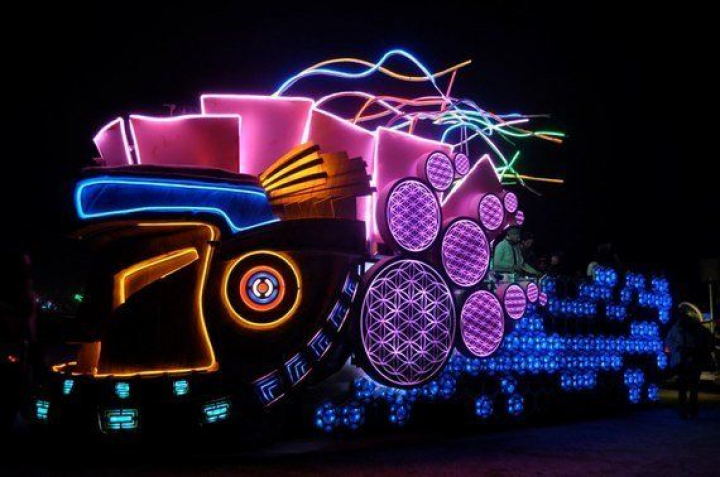 Ha vuelto a caer el sol, la incertidumbre de la oscuridad es iluminada por creaturas nocturnas, los pelos del Mayan Warrior son un faro, referente obligado, hogar. Salen los vampiros, es tiempo de ceremonias, de fiestas del cuerpo, un amasijo de músculos y contorsiones. Y la plácida noche vulnerada por el ruido rosa vuelve a incendiarse y es ahora la luz artificial la que le ha ganado la batalla a Helios. Los art-cars surcan la inmensidad de la oscuridad rasgándola con sus electrizantes diseños y las formas ahora respiran de noche. La botella de mi bella genio cede el paso a un tiburón, al space-shuttle que casi no toca el suelo y todos se congregan como satélites alrededor de un planeta y una miríada de asteroides, bicicletas sin rumbo fijo; mosquitos zumban a su lado en una playa tropical.