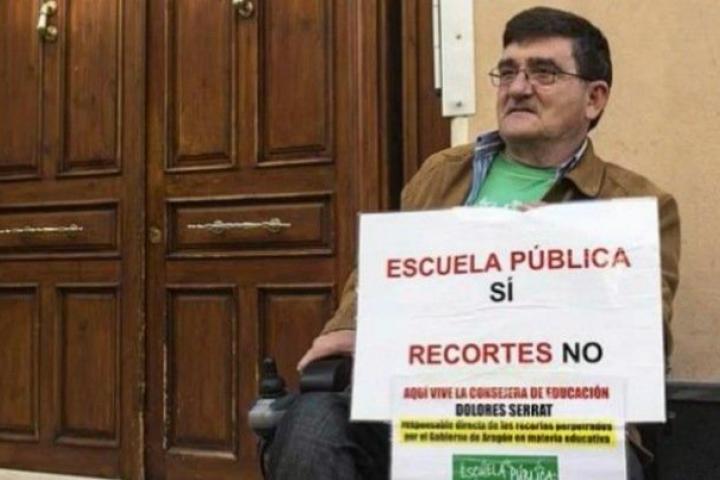 Desde hace más de dos años, cuando lo conocí sentado en su silla de ruedas en la calle Alfonso de Zaragoza al pie de su diaria reivindicación en pro de una escuela pública y laica, sabía que la determinación tomada el martes por el profesor Antonio Aramayona formaba parte de su tránsito vital y mortal. Me lo dijo mientras comíamos en un modesto restaurante, cerca de su casa, antes de despedirnos. La mañana anterior nos habíamos congregado un grupo de amigos, alumnos y compañeros de Aramayona para conmemorar su primer año ante el portal de la consejera de Educación del Gobierno aragonés.