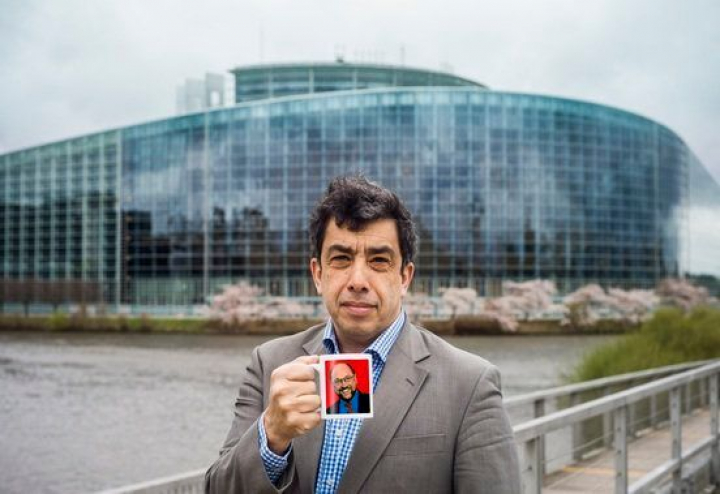Foto de Pascal Bastien. Fernando Morales-de la Cruz, fundador de CAFÉ FOR CHANGE frente al Parlamento Europeo en Estrasburgo