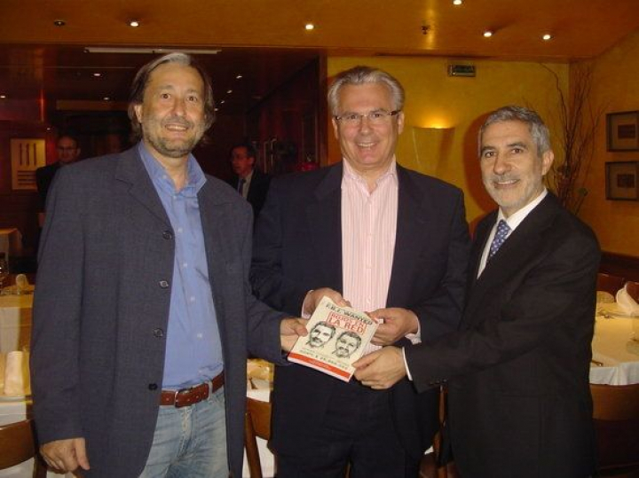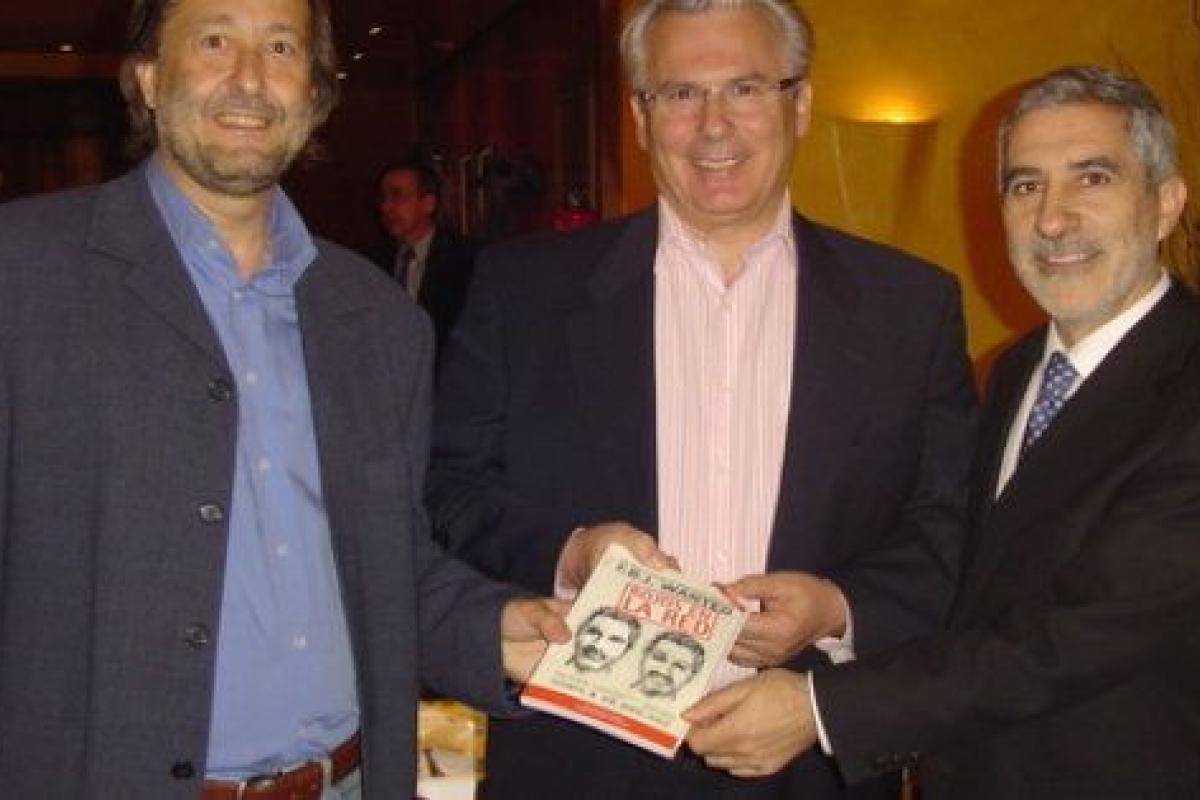 De izquierda a derecha, José Mendi, el exjuez Baltasar Garzón, que prologa el libro, y Gaspar Llamazares.