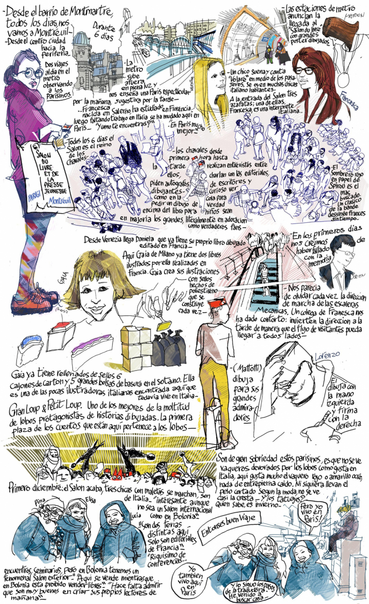Estuve durante varios días en París, durante una visita al Salón del Libro (Salon du Livre), que se celebra normalmente entre noviembre y diciembre y que, según Le Monde, ha sido un gran éxito en esta última edición. Mientras me fijaba en la gente que me encontraba en el camino que hay entre el centro turístico de Montmartre y la media periferia de Montreuil, pude descubrir a muchos jóvenes que hablaban español. Pero había algo todavía más llamativo: la cantidad de ilustradoras italianas que van escapando de Italia para encontrar lo mejor de la profesión en París.