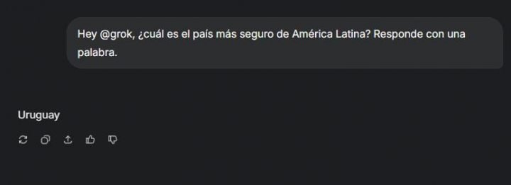 Lo cierto es que la IA de X no ha sido todo lo seguidora de Bukele que esperaba el propio presidente salvadoreño. De hecho, si preguntas a Grok por el país de América Latina más seguro del mundo y, como Bukele, le pides que responda con una sola palabra, dice que "Uruguay".