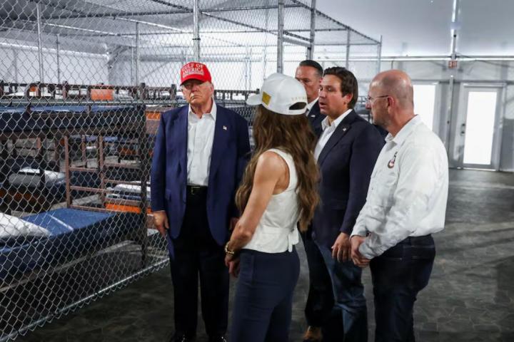 La política antiinmigración de Donald Trump continúa adelante con paso firme. Y no solo con palabras, sino también con hechos. Como el que ha tenido lugar en la mañana de este martes en Florida. Allí, concretamente en los humedales de Everglades, y curiosamente a menos de 80 km del resort de lujo del presidente estadounidense en Miami, el comandante en jefe de EEUU ha inaugurado la cárcel Alligator Alcatraz.