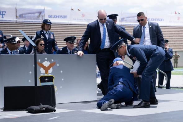 La historia se repite. Joe Biden, el presidente de EEUU, se ha vuelto a ir al suelo tras un llamativo tropezón en mitad de la ceremonia de graduación de los cadetes de la Academia de la Fuerza Aérea en Colorado.