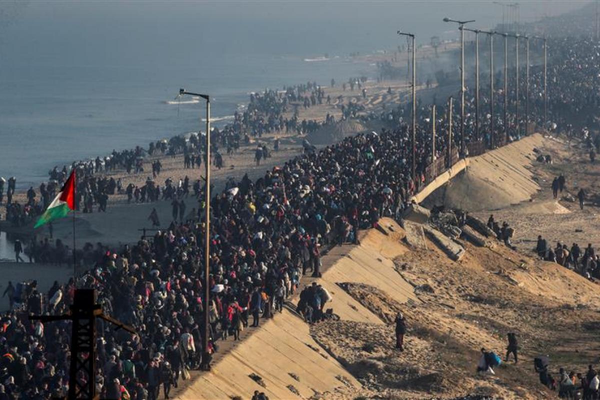 Miles de desplazados atraviesan ya la carretera de Rashid, que atraviesa Gaza de norte a sur junto a la costa, para cruzar Netzarim y volver a sus hogares o reencontrarse con los familiares que se quedaron en el norte.