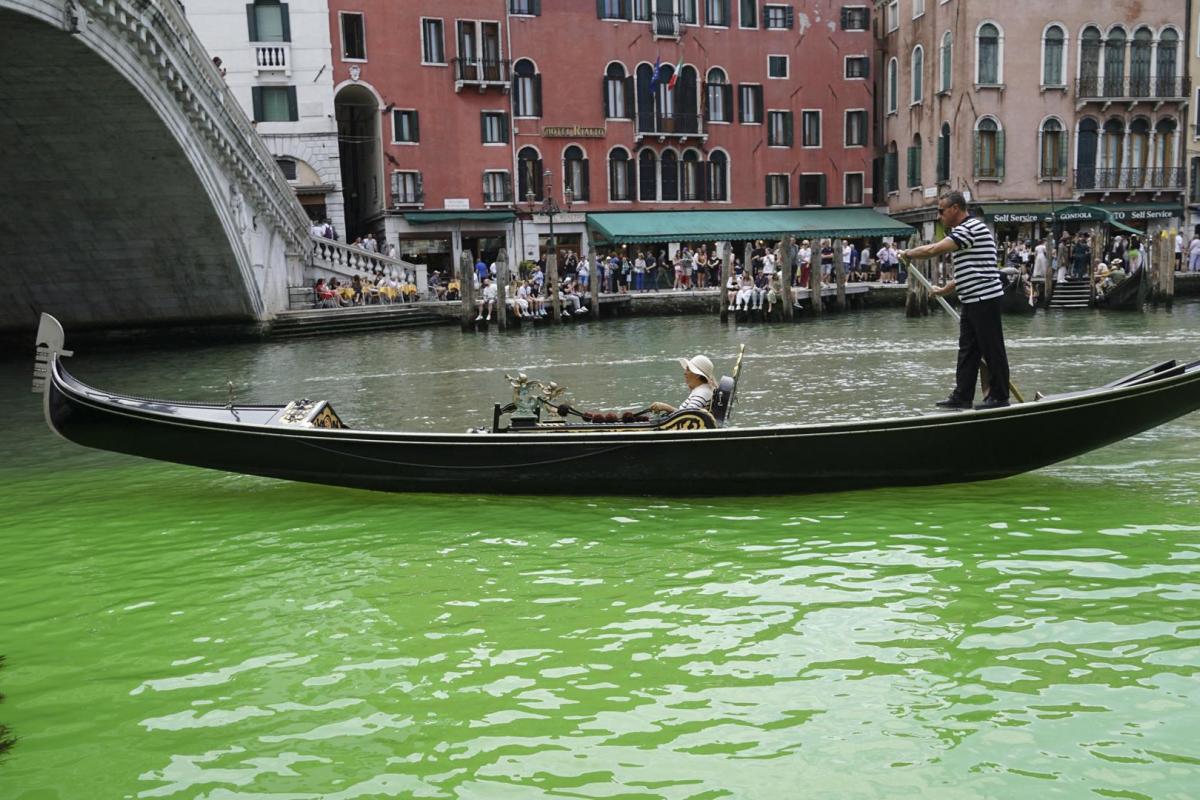 El agua del Gran Canal de Venecia, cerca del Puente de Rialto, se ha teñido este domingo de verde fluorescente, un líquido trazador que se utiliza para comprender el camino que sigue el agua, mientras aún se desconocen el origen y los motivos de lo sucedido.