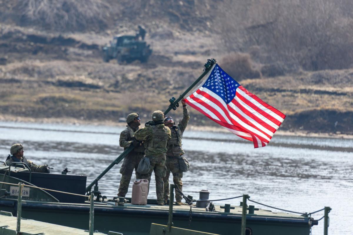 Soldados de EEUU izan su bandera durante un ejercicio entre su país y Corea del Sur y Estados Unidos, llamado Escudo de la Libertad, en la ciudad de Yeoncheon (Corea del Sur), en marzo de 2025.Kim Jae-Hwan / SOPA Images / LightRocket via Getty Images