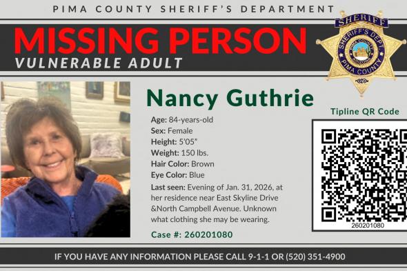 Nancy Guthrie fue vista por última vez el sábado por la noche en su casa en Catalina Foothills, cerca de Tucson, hace seis días. Tras la denuncia de su desaparición, hecha ya el domingo, las autoridades encontraron una escena "muy preocupante" en su vivienda, lo que dio pie a una investigación criminal, según declaró Nanos.