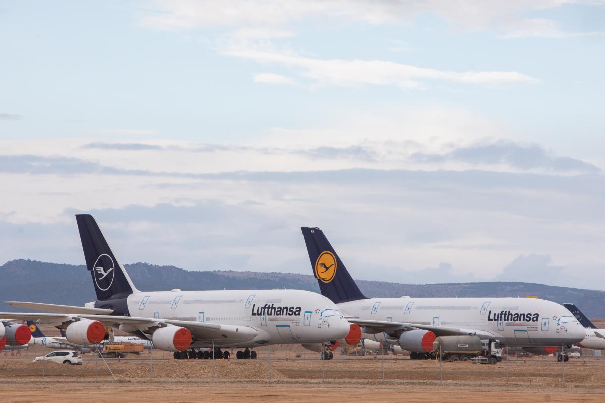 Por un lado se encuentra el Etihad A380, de nueve años y con matrícula A6-APE. Fue la primera aeronave que despegó en 2020 desde el lugar en el que se encontraba con destino a Abu Dabi, mientras que el otro avión, de Lufthansa, fue entregado en 2010 a la aerolínea alemana (matrícula D-AIMA) y se unió al lugar de almacenamiento de la ciudad turolense en 2020.