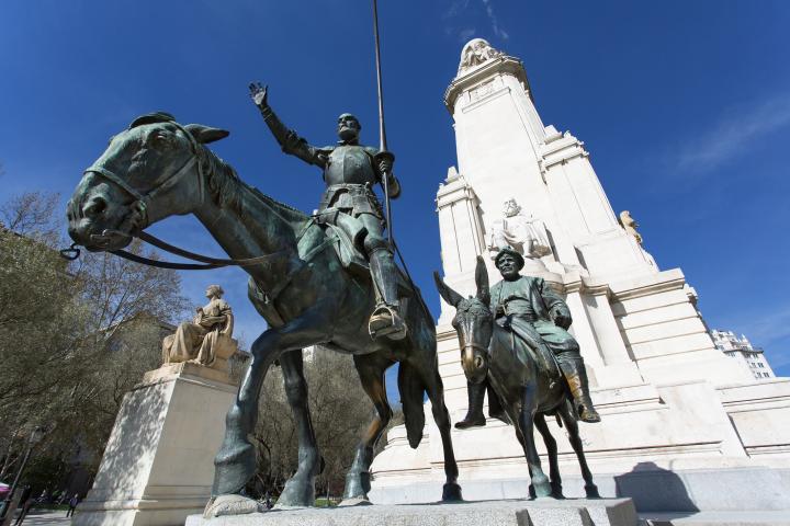 Este monumento se hizo en el año 1929 con el objetivo de decorar esta gran plaza de la capital y conmemorar la universalidad de la gran novela de Cervantes: El Quijote. Está formado por dos estatuas, que corresponden a Don Quijote y Sancho Panza, subidos a los lomos de su caballo y su burro, respectivamente.
