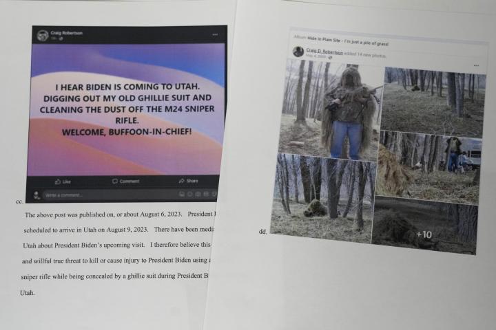 El pasado domingo, Robertson publicó un mensaje en el que aludía a la próxima visita de Biden a Utah este mismo miércoles y adelantaba que "quitaría el polvo a su fusil de francotirador M24". Los documentos judiciales recogen fotos del sospechoso con este armamento y vestido con ropa de camuflaje.