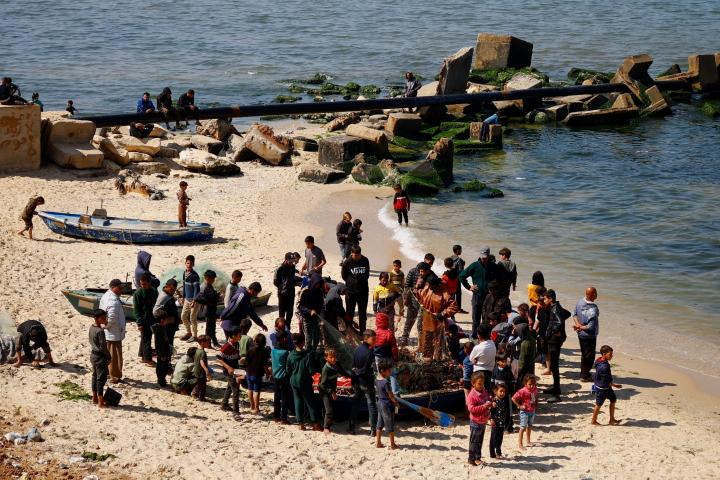 Un grupo de gazatíes tratan de sacar peces de una red en una playa de Rafah, al sur de la franja, el 26 de febrero pasado.Ibraheem Abu Mustafa / REUTERS