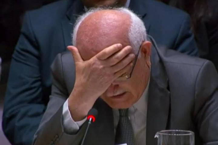 El representante permanente de Palestina ante la ONU, Riyad Mansour, ha protagonizado una de las imágenes del día durante la sesión del Consejo de Seguridad de este miércoles en Nueva York ante el resto de representantes internacionales.