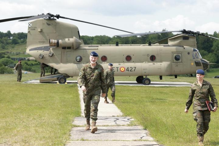El rey de España se ha desplazado desde Bratislava en un helicóptero Chinook del Ejército de Tierra a esta base de entrenamiento en el sur de Eslovaquia, y donde el grupo de combate ha ejecutado unas maniobras en las que ha demostrado su capacidad de operatividad como brigada internacional.
