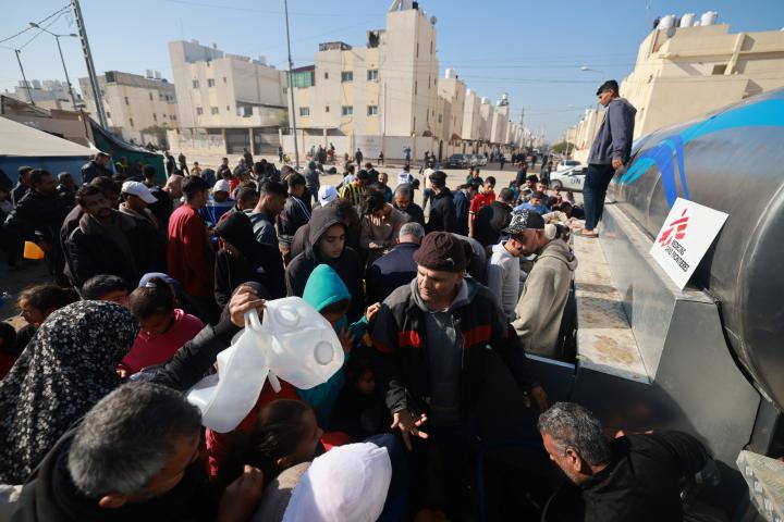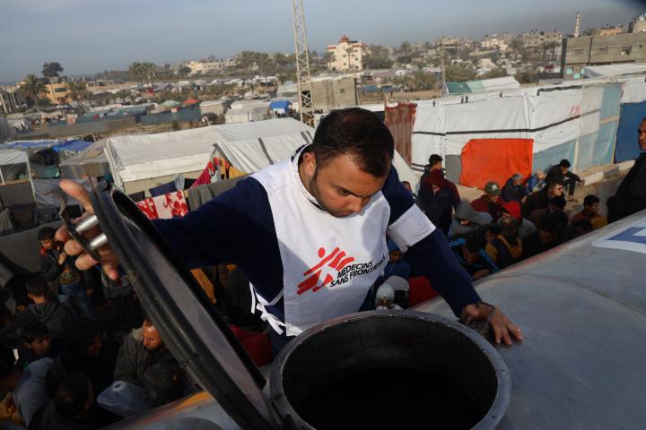 "En una situación normal, una persona necesita entre dos y tres litros de agua potable al día", explica Youssef Al-Khishawi, agente de agua y saneamiento de MSF. "Ahora, con la escasez actual, la media para una familia de seis miembros es de apenas un galón de agua (3,8 litros, poco más de medio litro por persona)".