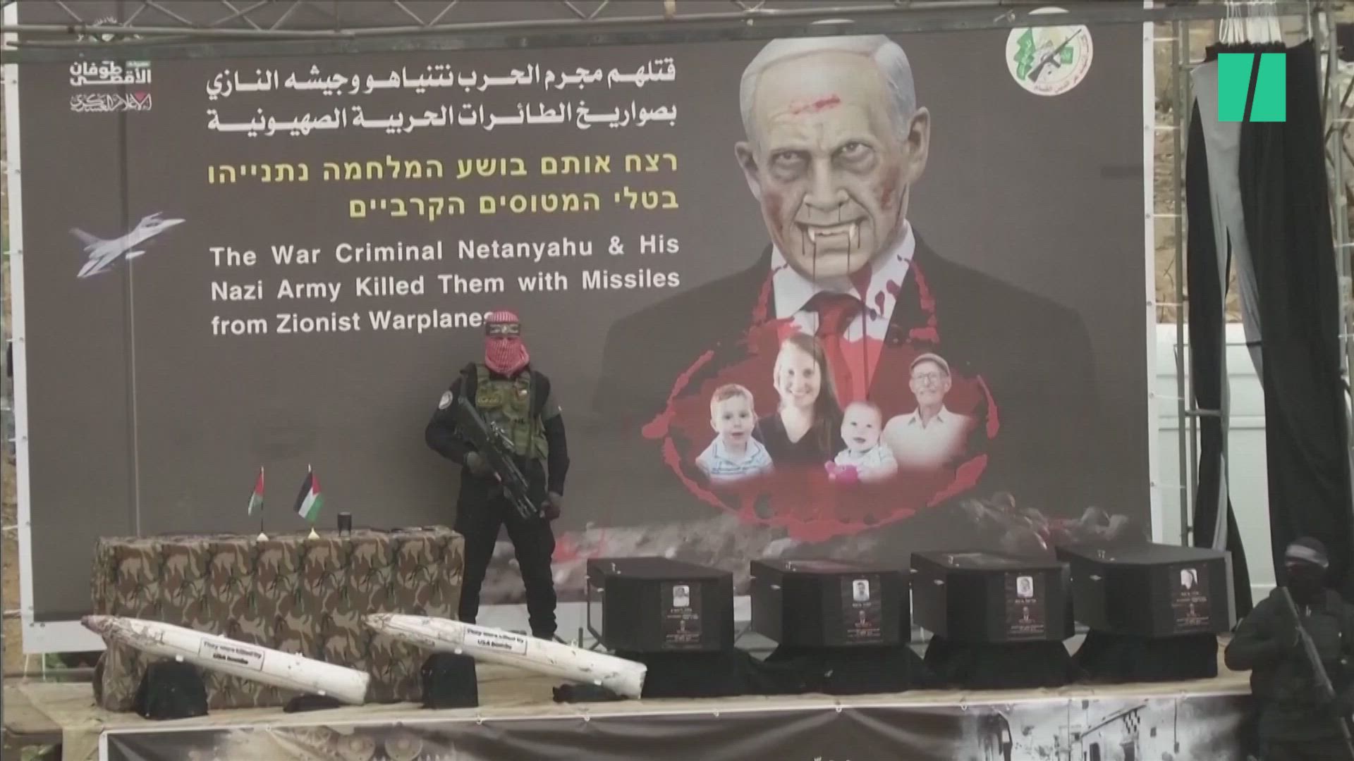 Los milicianos dispusieron sobre un escenario los ataúdes, de color negro y con los nombres de Shiri Silberman, mujer de ascendencia peruana y argentina capturada el 7 de octubre de 2023 con 32 años, y sus hijos, Ariel y Kfir Bibas, con 4 años y 9 meses respectivamente, así como el de Oded Lifshitz, que tenía 83 cuando fue secuestrado.