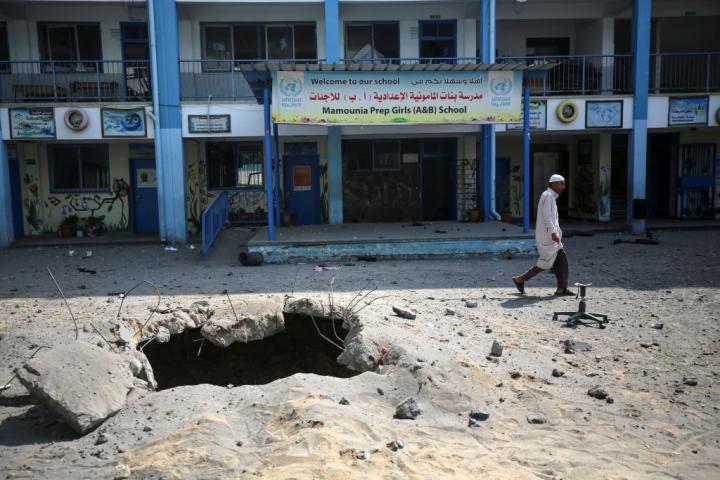 ¿Qué es lo que queda, si todo está cerrado a cal y canto y no hay ni refugios antiaéreos o sirenas, como en el otro lado de la frontera? Queda buscar alojamiento en algún edifico de Naciones Unidas, especialmente en las escuelas de la UNRWA, que se supone que son zonas neutrales porque la legislación internacional prohibe atacarlas.