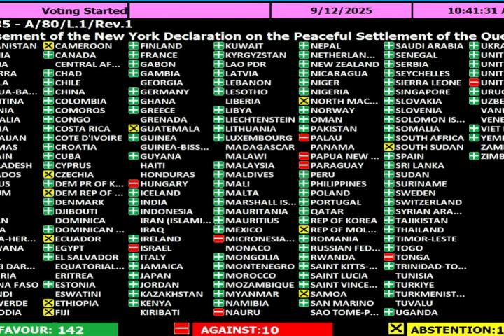 Por el momento, el 75% de los Estados que conforman la ONU reconocen a Palestina como Estado (147 de 193). Además, por primera vez se condena en un texto de la ONU los ataques del 7 de octubre de 2023 realizados por Hamás, exigiendo su desarme y su exclusión del Gobierno.