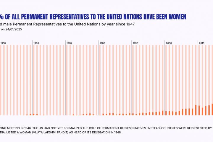 De los 193 Estados miembros, 73 nunca estuvieron representados ante la ONU por una embajadora y 64 lo han estado sólo una vez. Así, sólo el 7% de los más de 2.800 representantes permanentes que han servido como embajadores ante las Naciones Unidas desde 1947 han sido mujeres. Los cambios son recientes: tuvieron que pasar 52 años (hasta 1999) para que el número de embajadoras en la ONU superara el 5% del total. En 2024, apenas un 21 % de los embajadores eran mujeres.