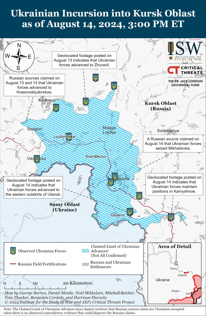 Desde el inicio de la operación las tropas ucranianas han avanzado 35 km y ostentan el control de 82 asentamientos y 1.150 kilómetros de territorio. Además, el 15 de agosto, Ucrania puso en marcha la primera oficina del comandante militar en la región. Se trata, posiblemente, de la mayor operación ucraniana sobre el territorio ruso desde el inicio del conflicto, y funcionará, por lo menos, para levantar la moral de las tropas ucranianas, después de meses de estancamiento.