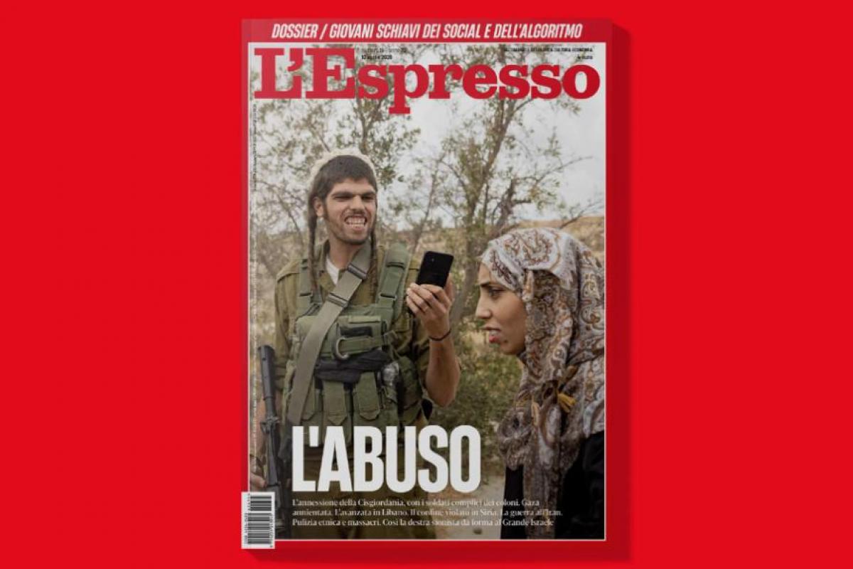 Un hombre con kipá, el casquete redondo que acostumbran a usar los judíos, y peyot, los dos mechones rizados típicos de los judíos ultraortodoxos, apunta con la cámara de su teléfono móvil a una mujer palestina con hiyab. Él es un colono israelí vestido de militar y sostiene un arma; ella, desarmada, una joven víctima de los cada vez más extendidos asentamientos israelís en Cisjordania. La imagen, tomada por el fotógrafo italiano Pietro Masturzo, protagoniza la última portada del semanario L'Espresso, un número que relata los abusos de los colonos israelíes, apoyados por su Ejército, y que ha recibido las críticas del Gobierno de Benjamin Netanyahu.