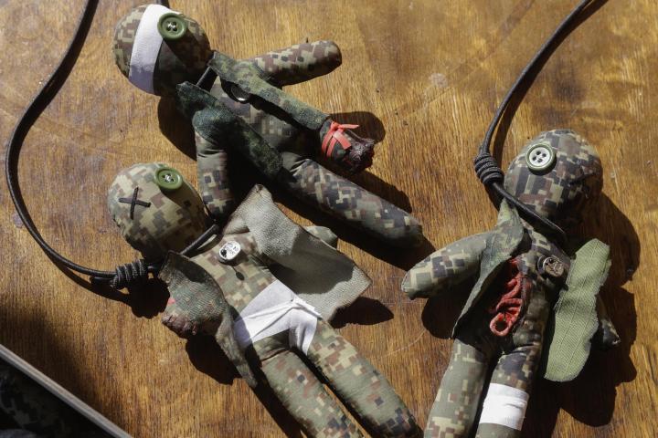 Estos están hecho con uniformes militares rusos usados, que representan a soldados rusos heridos. Los uniformes rusos provienen de sus colegas y amigos que trabajan o sirven cerca de la línea del frente.