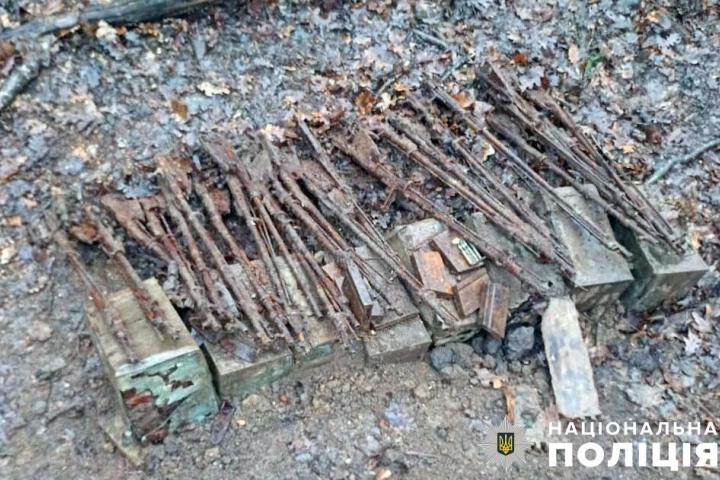 La policía de la región de Poltava recupera cajas de municiones y piezas de fusiles de la Segunda Guerra Mundial.