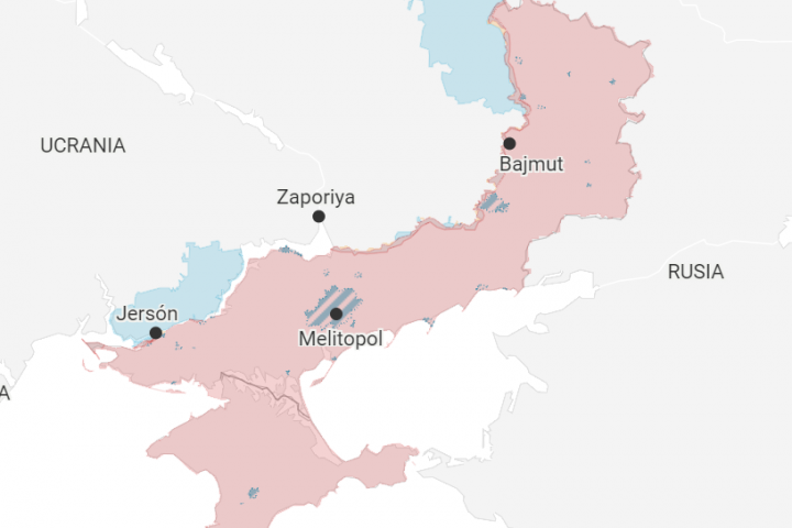 El mapa anterior, que muestra el frente de guerra en el que pugnan ambos países, apenas se ha movido en los últimos seis meses, algo que empaña sin remedio la efeméride rusa, que ve como se estancan los frentes o ha llegado a perder la provincia de Jarkov y la ciudad de Jersón desde finales del verano pasado.
