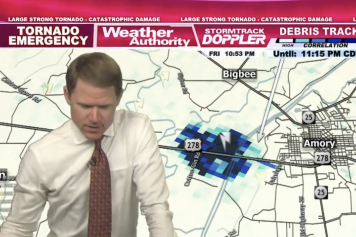 Segundos antes, acababa de decir que se trataba de un tornado poderoso, pero que su trayectoria era imprevisible. Una de las que proyectó, pasaba por el norte de la localidad de Amory.