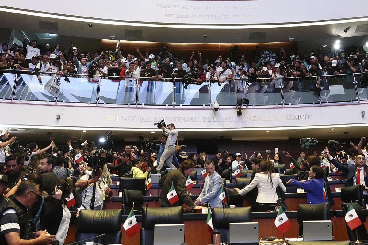 La larga jornada fue interrumpida durante la tarde por un grupo de opositores a la reforma judicial que irrumpieron entre agresiones y empujones en el Senado para intentar detener la aprobación del texto, lo que obligó a los legisladores a trasladarse a la antigua sede de la cámara alta para continuar con su sesión legislativa.