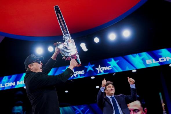 Después del primer encuentro, con Elon Musk arengando al público reunido en el centro de convenciones Gaylord, en Washington, la mano derecha de Donald Trump y Milei han escenificado un pequeño entremés en el que han simulado un encuentro no programado y la entrega de un regalo desenvuelto entre bambalinas. "Milei tiene un regalo para mí", le soltó el supuesto responsable del Departamento de Eficiencia Gubernamental (DOGE) a un público enfervorizado, que se vino arriba con aplausos.