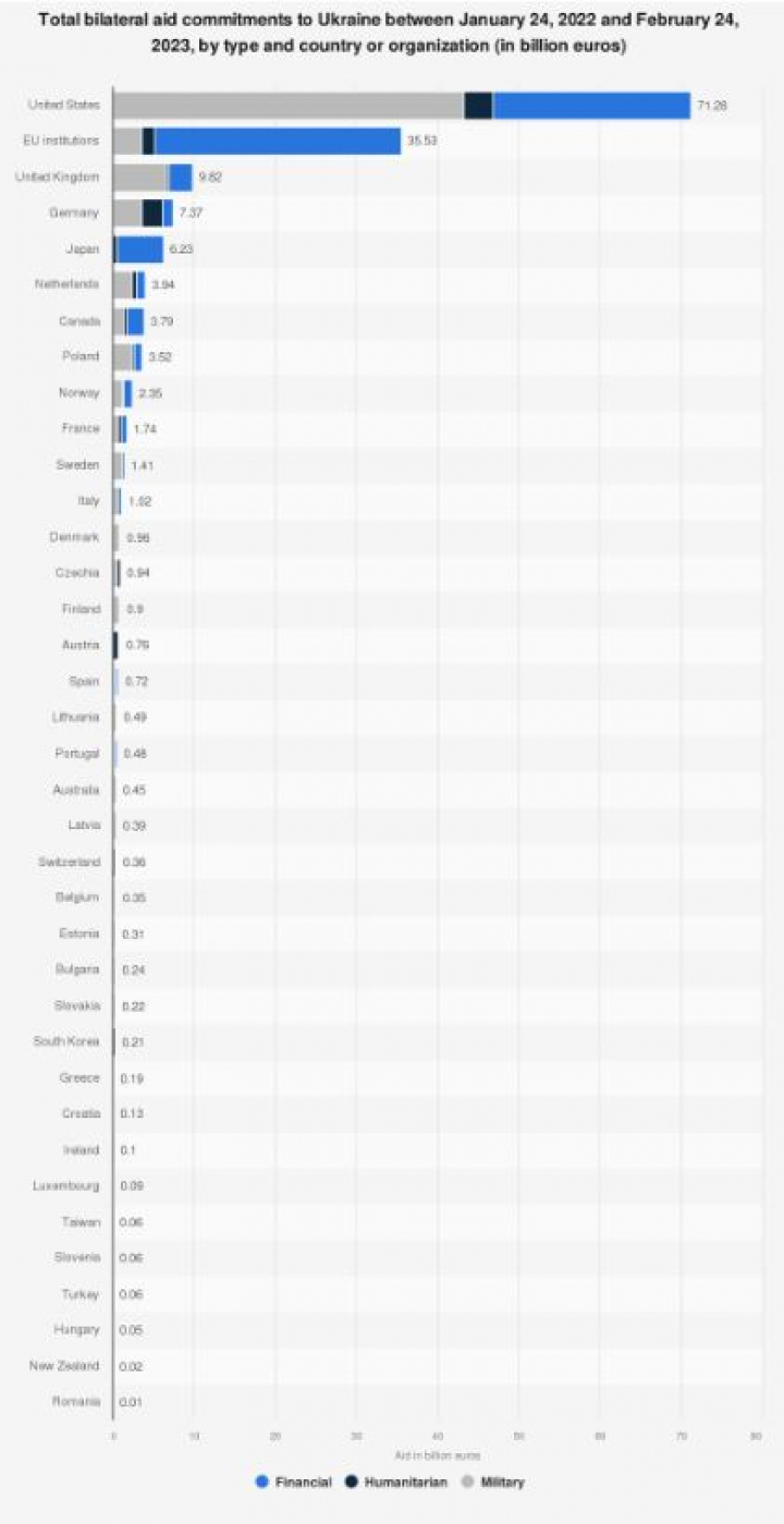 La plataforma Statista ha recopilado todos los datos relacionados con el apoyo que Ucrania ha recibido lo largo del 2022 por parte de distintos países del mundo y así se intuye, a golpe de vista, la importancia de lo movilizado hacia Kiev y sus intereses: