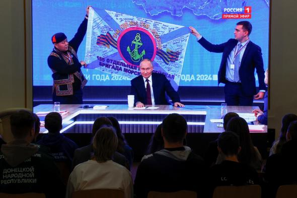 "Los combates son complicados por lo que pronosticar el futuro es difícil y falto de sentido", dijo el jefe del Kremlin, quien aprovechó los primeros minutos de su intervención para mostrar al público el estandarte que le regaló una de las brigadas aerotransportadas que combate en Ucrania.