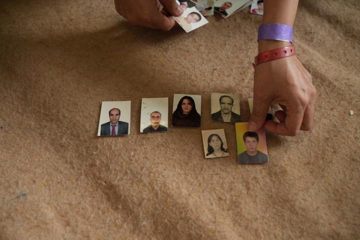 "Tengo fotos de mi marido, de mis hijos, de mis hermanos, de mis mejores amigos, etc. Incluso ésta, que es la que figuraba en mi carné de estudiante universitario. La más preciada para mí es la de mi padre, que falleció. Llevo todas estas fotografías conmigo para mantener vivos los recuerdos. Con la guerra de Siria, cada uno se fue a un sitio diferente. Algunos de mis amigos se fueron a Noruega, otros a Holanda, algunos se quedaron en Damasco, yo me fui a Kobane [en el norte de Siria]. Tuve que dejar la universidad, mi barrio, mis amigos, el lugar en el que crecí. La guerra nos dispersó y aunque hace años que no los veo, con las fotografías, sus recuerdos permanecen".