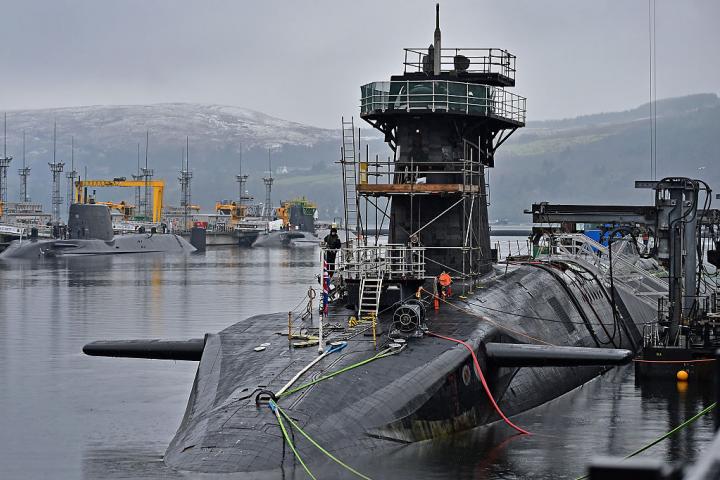 Y ahí vienen las armas nucleares radicadas en la costa oeste de Escocia que son, "sin duda", "más una tecnología estadounidense que británica". Los submarinos, aunque construidos en Barrow-in-Furness (Inglaterra), "se ensamblan según planos estadounidenses y con componentes estadounidenses. Los misiles Trident disparados por los submarinos se construyen, suministran y mantienen en Estados Unidos".