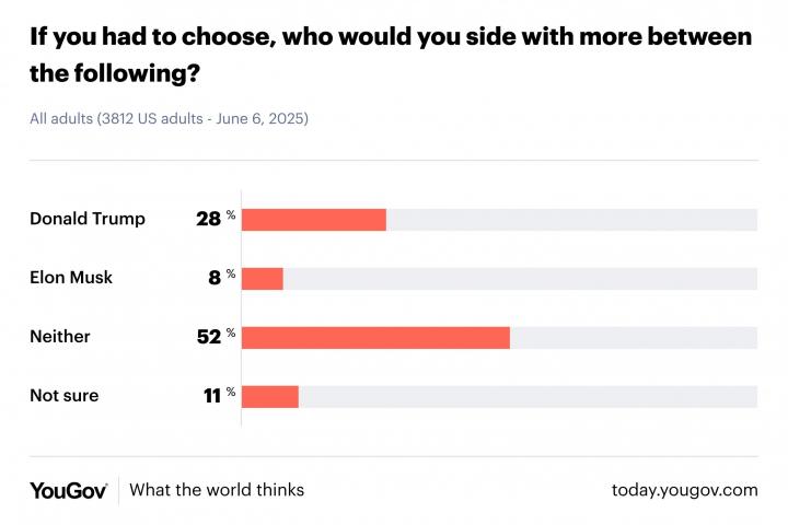 El hecho de que Musk se piense o no dar dinero no inquieta sólo a Trump sino a todo el Partido Republicano que, dejando de lado su centenaria historia prodemocracia conservadora, se ha echado en los brazos del magnate y ve por sus ojos, obra por sus actos, depende de él. El movimiento MAGA (Make America Great Again) se ha posicionado por ahora con el presidente en este cisma, pero duele desdecirse: eran legión los que aplaudían a Musk y avalaban que alguien de su perfil, sin experiencia, estuviera en un alto cargo gubernamental. Una encuesta de YouGov USA indica que una mayoría de republicanos se sitúa del lado del presidente en su disputa con su antiguo aliado: 28% frente a 8% que apoya al empresario. Hay un 52% que pasa de los dos.