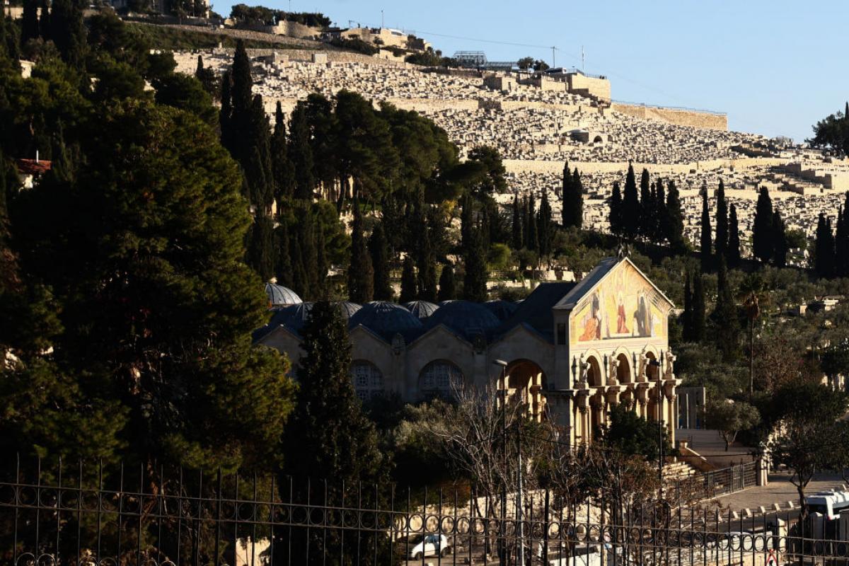 El Monte de los Olivos está frente a los muros de Jerusalén, cara a cara con la Explanada de las Mezquitas, con una de las vistas más impresionantes de la ciudad. La Custodia de Tierra Santa de la Orden Franciscana tiene allí la Basílica de Getsemaní o de las Naciones. En su interior se encuentra la porción de roca en la que, según la tradición, Jesús oró la noche de su arresto. Es la zona por la que baja la procesión del domingo, por lo que a sus espaldas están las casas de los colonos, también. Antes de descender del monte, se encuentra el lugar donde la tradición ortodoxa sitúa la tumba de María, madre de Jesucristo.