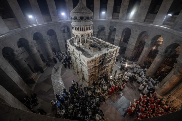El corazón del templo lo controlan los ortodoxos y es el Edículo, un templete situado sobre la pequeña cámara funeraria en la que se cree fue enterrado Jesús y resucitó al tercer día de su muerte. Según los evangelios, el lugar era una tumba nueva tallada en la roca, una cámara supulcral propiedad de un rico judío seguidor de Cristo llamado José de Arimatea, cerrada con una gran piedra. "Él bajó de la cruz, lo envolvió en una sábana, y le puso en un sepulcro tallado en la roca, en el que nadie había sido puesto". Hasta que llega la luz para los cristianos. "¿Por qué buscáis entre los muertos al que está vivo?", escribe de nuevo Lucas.
